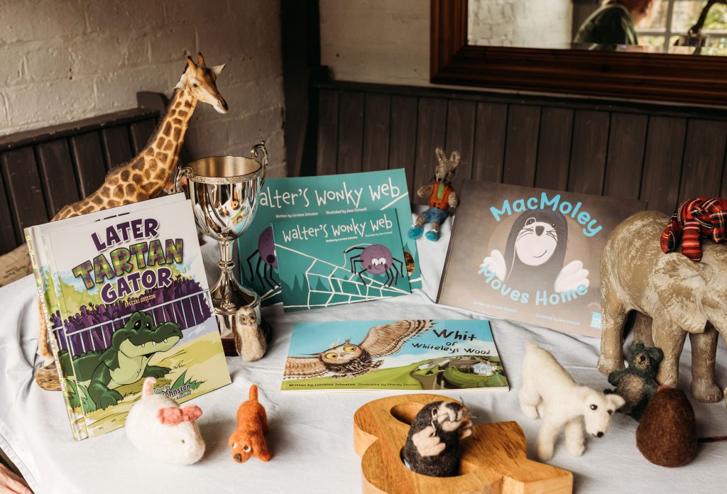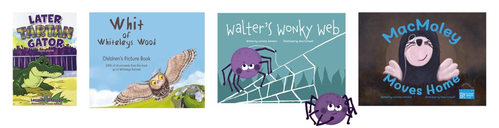 So far, I’ve published four children’s books, three of which support Scottish Charities; Later Tartan Gator, Whit of Whiteleys Wood, MacMoley Moves Home and Walter’s Wonky Web.